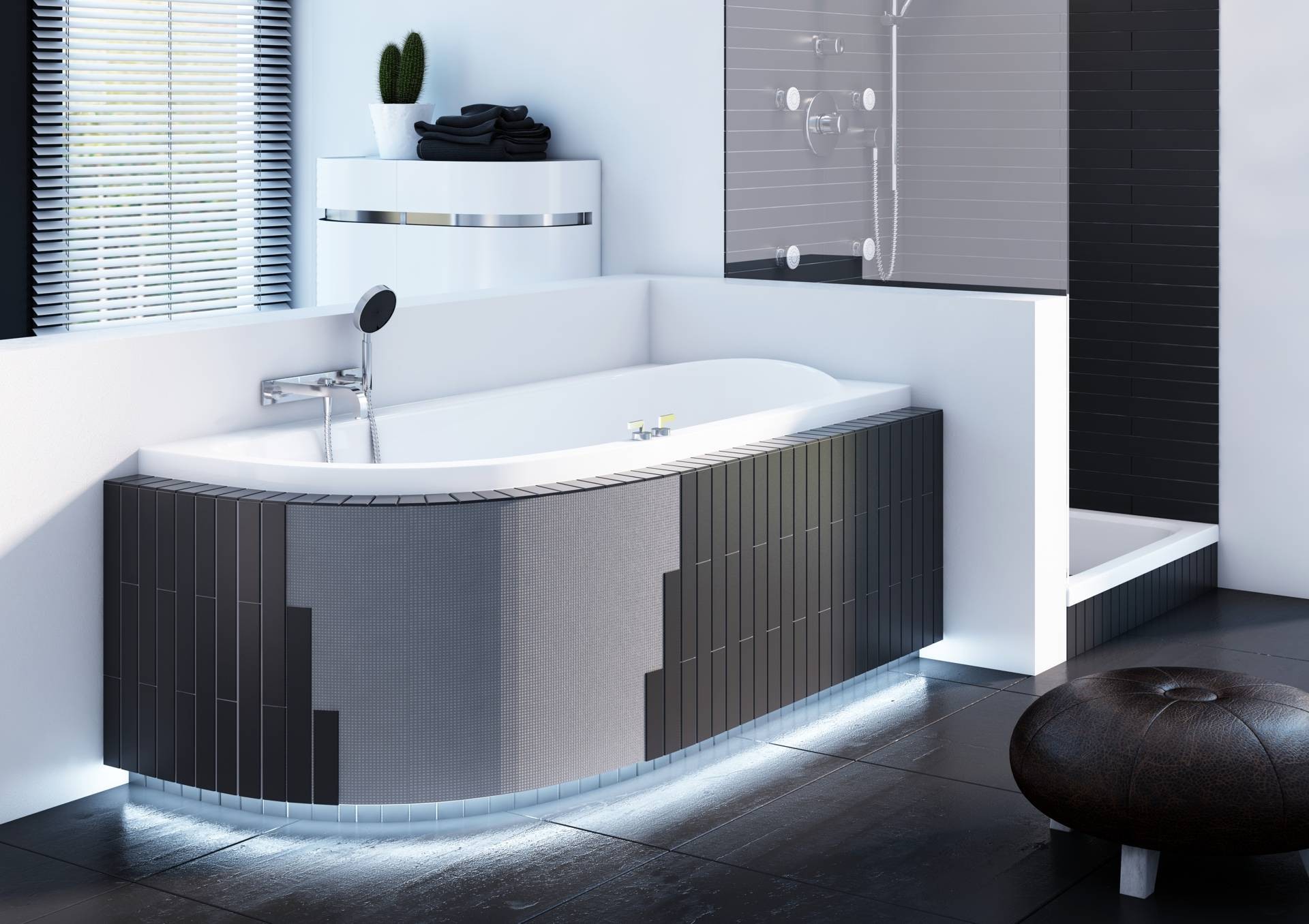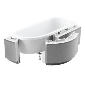Obudowa z półką (13,5cm) i podcięciem na stopy/LED pozwala nie tylko na zabudowanie każdej wanny półokrągłej (max 270 cm długości łuku) czy prostokątnej, ale także dzięki wycięciu w dolnej części na zamontowanie efektownego oświetlenia LED. Dzięki możliwości demontażu bez uszkodzenia glazury obudowy można zastosować także przy wannach z hydromasażem.